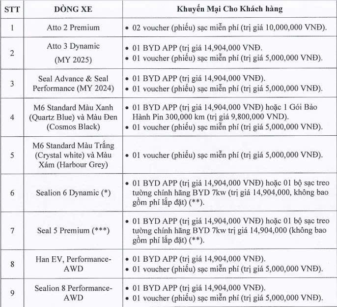 - BYD Han EV, Sealion 8 và M6: Khách hàng mua xe sẽ được tặng 01 BYD APP trị giá 14,904,000 VNĐ và 01 voucher sạc miễn phí trị giá 5,000,000 VNĐ. Riêng với dòng BYD M6, quý khách còn có thêm lựa chọn bảo hành Pin lên đến 300,000 km hoặc 01 BYD APP.
